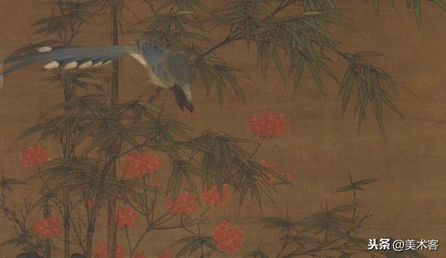 边景昭的《春花三喜图》,此幅湖石沉雄,秀竹劲挺而葱郁。红色的鲜花丛簇而生,夺人二目,两只喜鹊于位于平坡之上,一只仰翻在地,一只上前戏啄,互相嬉戏玩耍,上面翠竹间的喜鹊俯视两只喜鹊,产生交流之感。