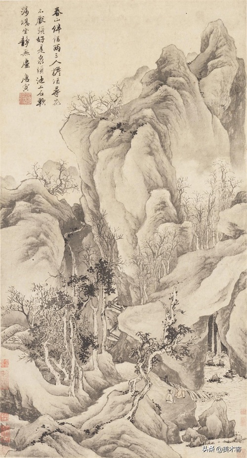 元代唐寅《春山伴侣图》,此幅作品上题诗曰:“春山伴侣两三人,担酒寻花不厌频。好是泉头池上石,软莎堪坐静无尘。”诗词与画面呼应,画中山石上的枯枝,新生的嫩芽,都意为“春山”。又看画中两人对坐,似在寻幽晤谈,呼应“伴侣”两字。