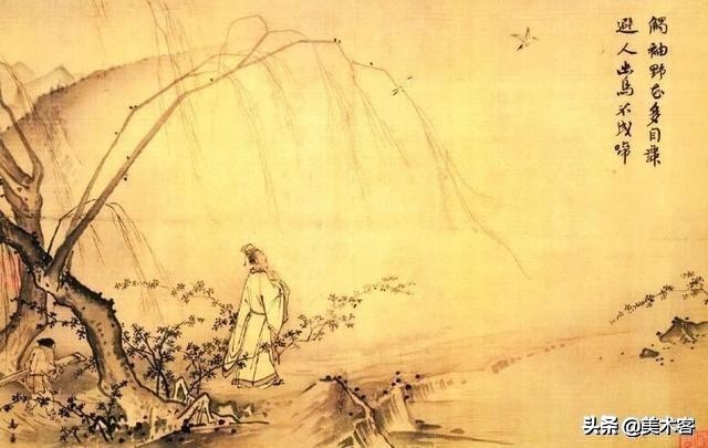 马远的《山径春行图》是幅小品,刻画的是春天的江南,一名儒雅的文人,带着携琴的小童,散步在春日的山径,徜徉于翠柳之间。柳树技法非常有味道,画出柳色青青、柳条依依的感觉,更是将春季柳树抽新蓬勃之气表达了出来,以此体现春天的气息。柳树上方一对黄莺婉转而下,周围野花芳菲,春野从容,万物生机盎然,笔墨间洋溢着喜悦的情绪。