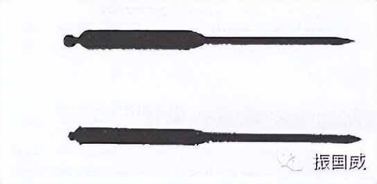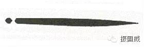 天真正传香取神道流 该流派在日本历史悠久,卓越不凡,以实战武技而著称。香取神道流是综合的古流武术,其武技中包含多种兵器的技艺,也包括剑法和手里剑。与其它流派相同,手里剑是作为剑术的一部分来传授的。下面描述了两种不同的手里剑。火箸形或筷子形手里剑,其剑身为四方形,一头锋利,一头粗厚。见图9。图8展示了另一种形状的手里剑,其根部截面是六边形的。