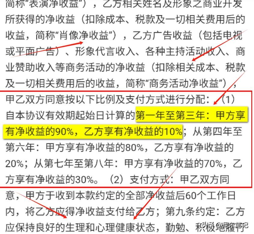 从合同可以看出,蒋佳恩不管是出演作品还是商演,和公司的分成是1/9分,公司9成,她1成,而在这个基础上,她是没有基本工资的。