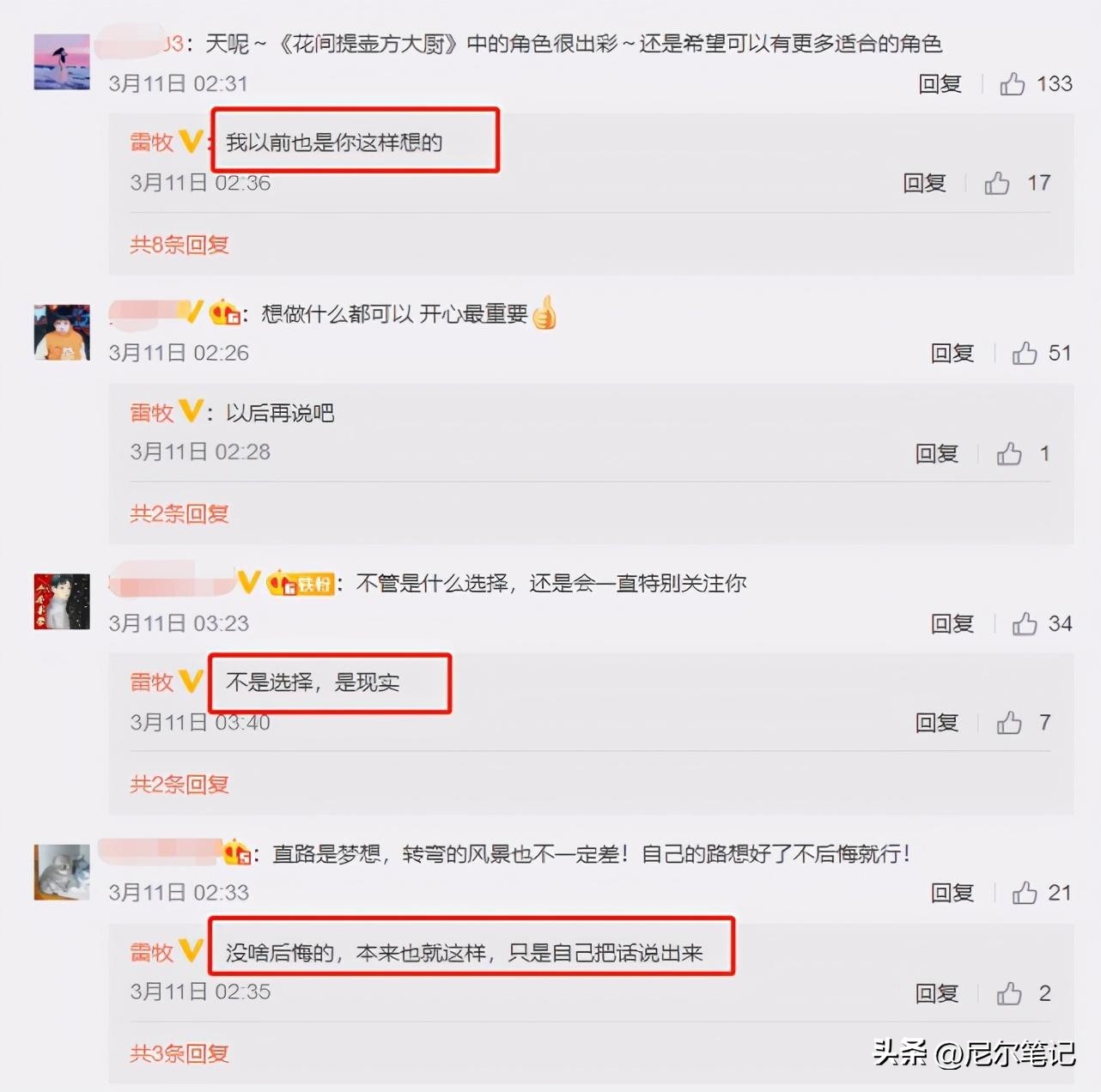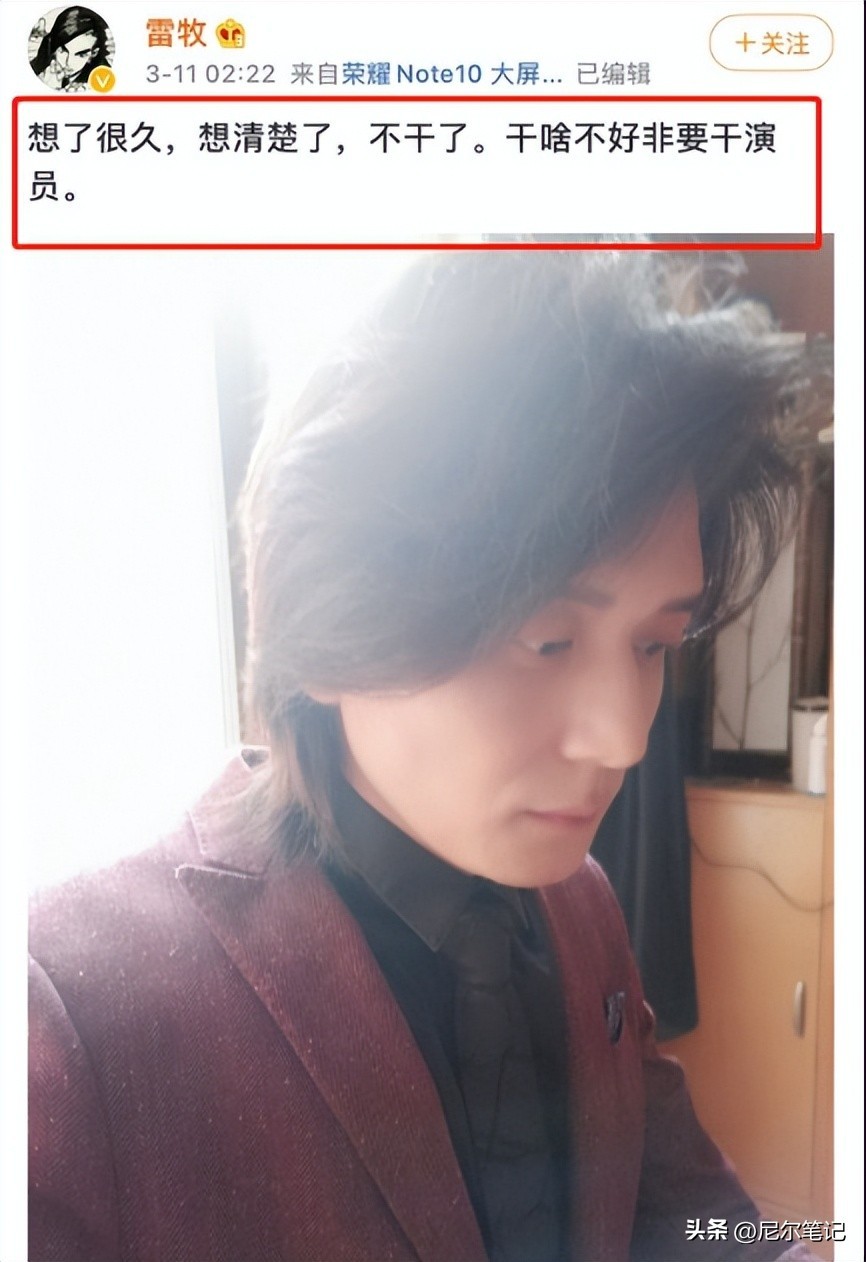 不过,2021年3月,就在蒋佳恩深陷与经纪公司的官司,背负百万欠款被法院限制消费时,雷牧突然在自己的社交平台上发文,用一句话,对自己的多年演员事业,划上了句号。