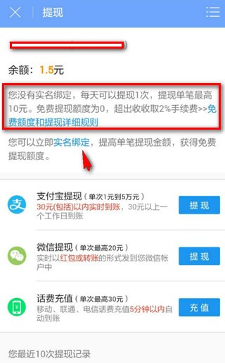 3.2 实名绑定后,每月有200元的免费提现额度,每日提现上限也相应提高。另外日常做任务,每做一个,免费额度都会增加。