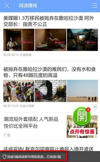 2.2 第2个任务是阅读,点击会跳转到文章列表,点击文章,下拉,阅读全文,屏幕最下方会显示有效阅读数量,够5篇后,会提示领取奖励。