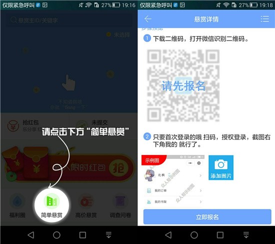 2.3 完成一个简单悬赏。按照指引来到简单悬赏页面,完成任务的步骤也基本就是日常做任务的步骤,先浏览看任务适不适合自己,想不想做,想做的话,点击最下方报名按钮。简单悬赏列表选一个微信关注类的好做的,进来之后,能看见要求,如下图这种简单的,立即报名后,二维码等显示出来,点击下载(保存图片),去微信扫二维码,完成任务,注意看要求截图是哪个,回来点击添加图片上传截图即可。任务要等任务主审核后,该任务才能完成,相应奖励入账。