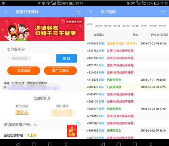 4、推广。红色的图标-师徒,可以二维码或者链接推广,下线通过你注册后,登录则奖励你0.3元(在现金明细里查询),其他奖励要求下线必须完成新手任务才给。邀请也很给力,我推广奖励也有1600多元了。