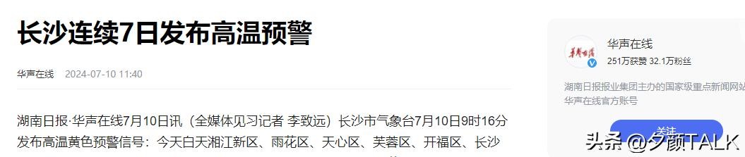 [5]官方媒体 华声在线2024年7月10日发布《长沙连续7日发布高温预警》
