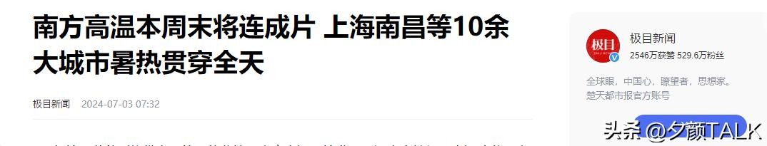 [4]官方媒体 极目新闻2024年7月3日发布《南方高温本周末将连成片 上海南昌等10余大城市暑热贯穿全天》