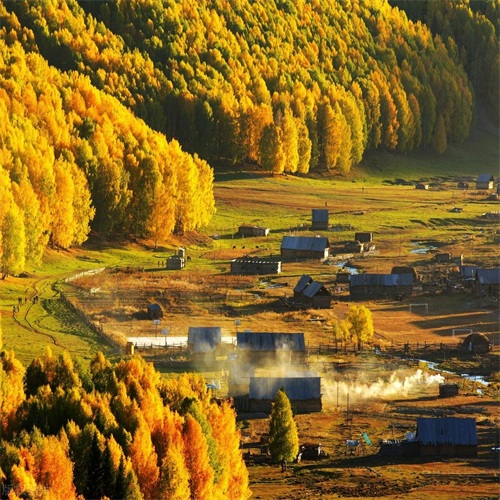 在被彩林环抱的禾木村,袅袅炊烟升起,散发着岁月的宁静与温柔,如一幅幅淡墨写意的画作,目之所及皆是金色画卷,令人神往。