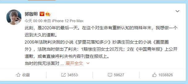 何炅曾在其主持的节目《拜托了冰箱》里这样评价过郭敬明“他在一个表演类的节目里获得观众评价的最佳辩手,有一句话叫做没有郭敬明吵不赢的架”。但这位被称之为没有吵不赢的架的人,在2020年的最后一天道歉认错了,为十五年前的错道歉了。事情过去了那么久,北京市高院也已经判决了,原告庄羽也申请强制执行了,为什么会在十五年后的今天道歉,是真的意识到自己的错误了真心道歉还是迫于现实的无奈,亦或是为了获得更大的利益。
