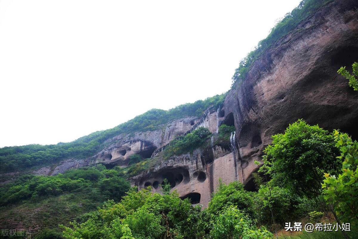 大别山石窟占地面积约25平方公里,属于大别山国家地质公园的一部分。也许你已经看过我国的四大石窟,但是大别山石窟的林、石、山、水交相辉映的景致,仍然可以打动你的心弦。1.6亿万年前的矿物质和岩石在风化、水流的侵蚀下,形成了独具特色的石窟群,因此也被称为“挂在悬崖上的地质历书”。