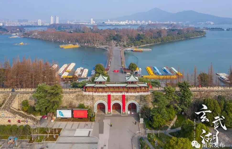 玄武门、玄武湖和远处的紫金山