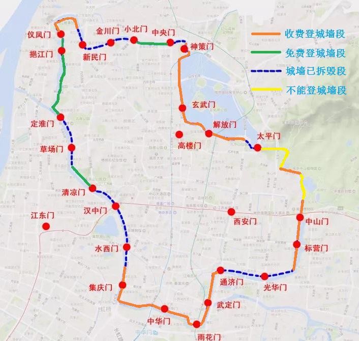 登城口:定淮门、华严岗门、金城花园、挹江门、仪凤门