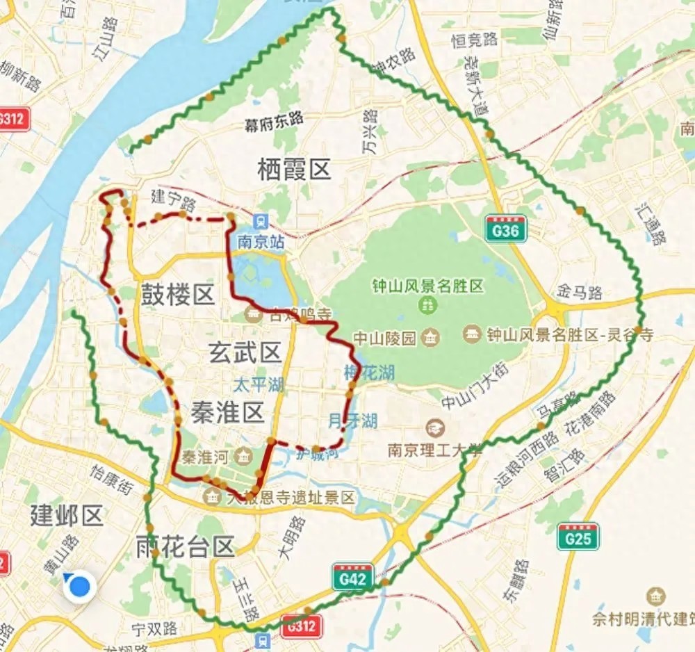 2、神策门—玄武门—台城(解放门)—九华山公园东门(约6km)