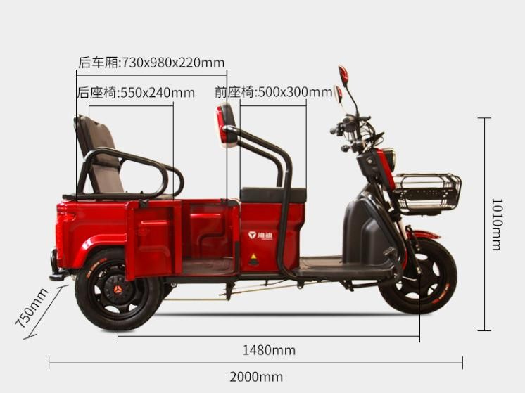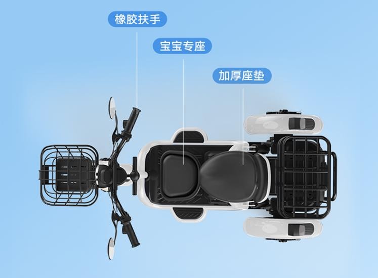 (4)功能配置:车辆设计的是3人乘坐空间,让老年人接送孙子、孙女出行需求得到满足,另外,这款车的后座为翻盖设计,能让作为“秒变”货箱,老年人出去买菜购物,出行佩戴头盔都有地可放。
