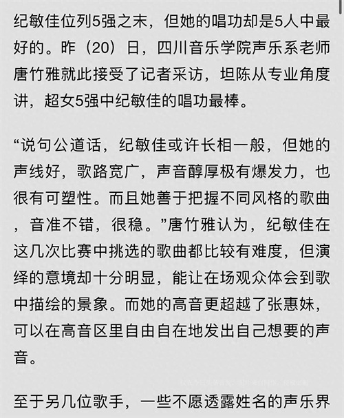 纪敏佳之所以备受喜爱,首先在于她过人的唱功。四川音乐学院的老师们评价她的唱功最为出色,声音醇厚有爆发力,同时具有很高的可塑性。这使得她在比赛中脱颖而出。