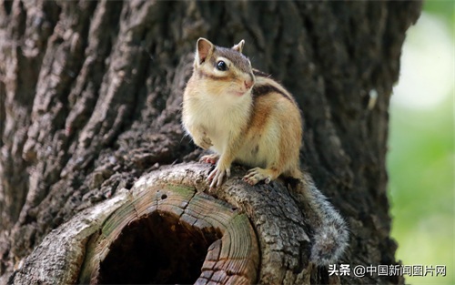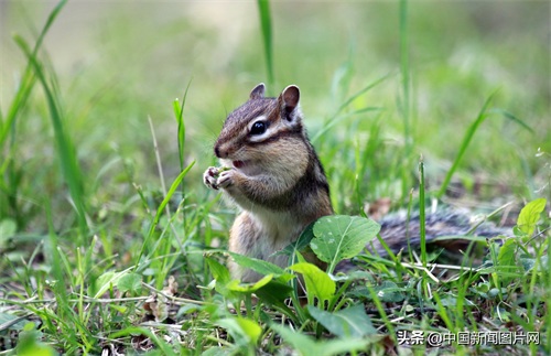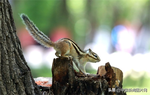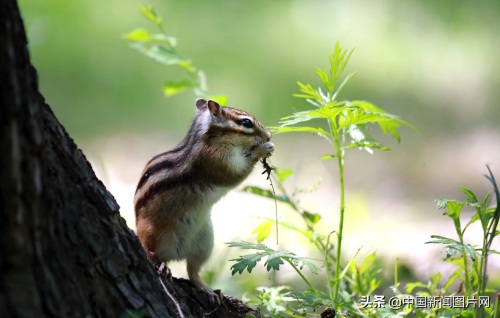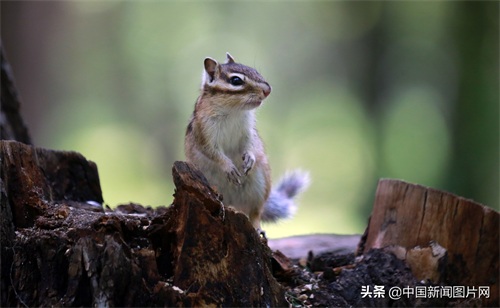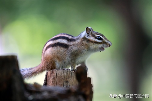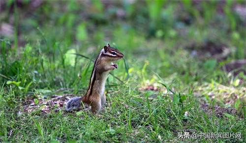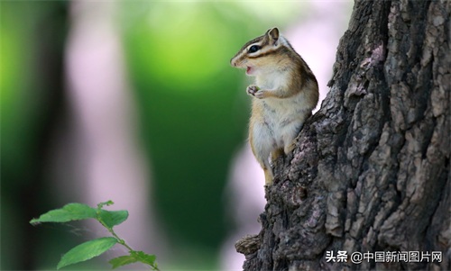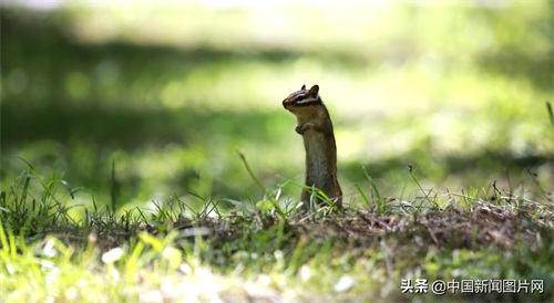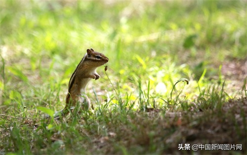 2021年5月31日,辽宁沈阳北陵公园里,野生花栗鼠在草地和树上窜来窜去寻找食物,萌态十足。中新社发 黄金昆 摄