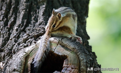 2021年5月31日,辽宁沈阳北陵公园,一只花栗鼠在树上休息,清理自己的皮毛。中新社发 黄金昆 摄