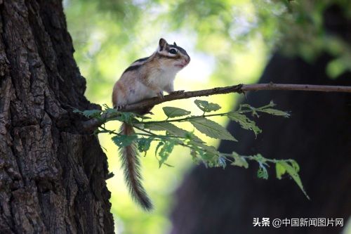 2021年5月31日,辽宁沈阳北陵公园,一只花栗鼠在树上观望。中新社发 黄金昆 摄