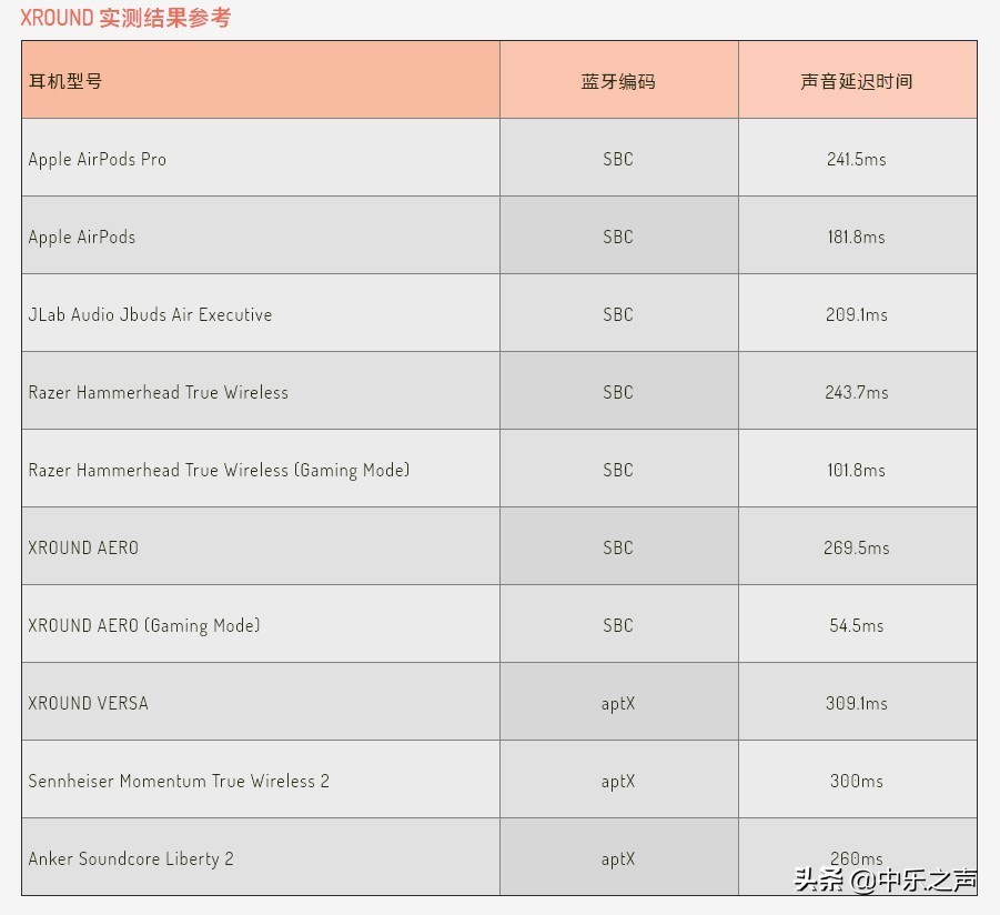 高通公布的编码延迟值数据(以下图表可作参考),其实是基于这个编码最“理想”的数字,当应用在耳机上,会受到蓝牙芯片、DAC解码,甚至是发射端的影响,实际测试出来的延迟值往往与官方公布的有很大的差异。譬如去年XROUND找来拥有ISO/IEC17025国际认证实验室、成立超过25年的专业认证机构Allion Lab.为多款真无线耳机进行声音延迟测试,实验室通过第三方的蓝牙发射器来测量理论值延迟(以下图表可作参考)。