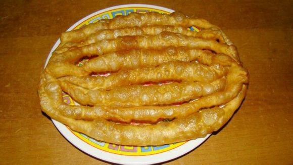 有人说八批果子的属地是聊城,也有人说认为是济南风味小吃,总之是跑不出山东地界的。果子其实就是油条,八批果子,说白点儿就是8根一起炸出来的油条,两端相连,形成椭圆形,因为可以分成八批而得名。