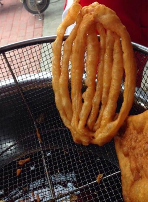 饧好的面切下一块,揉成1厘米左右厚的长条,当当当几下,就变成了均匀的小块,4小块面重叠在一起,中间用刀切透,两手捏两端,抻长下热油锅。下锅后要及时用长筷子将面块挑开,形成八批的椭圆形。这时里面的白矾、盐、碱要进行反应,分解出二氧化碳,在面团里产生气泡,油条就在这不知不觉中膨胀了。油条入锅先是沉底,很快就浮了上来,等上来的时候就已经是胖胖鼓鼓的样子,还会在油面上翻个儿。等到油条炸至呈深黄色就可以出锅了。