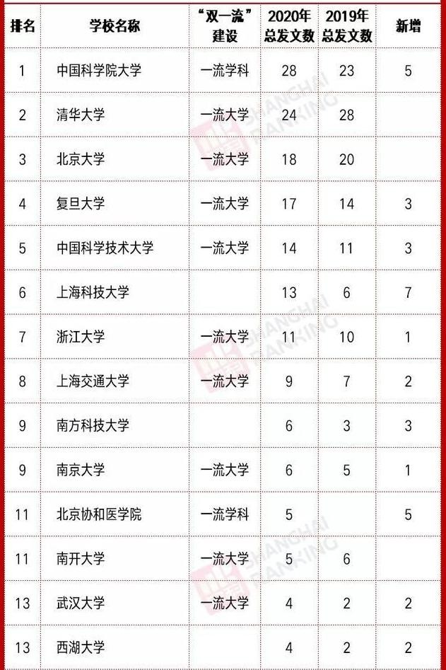 西湖大学2020年在《自然》和《科学》上一共发布了4篇论文,和武汉大学同名次,在全国排名第13位。