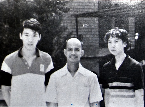 世界羽毛球冠军韩爱萍(女)田秉毅(男)与他们的启蒙教师陈福成在一起