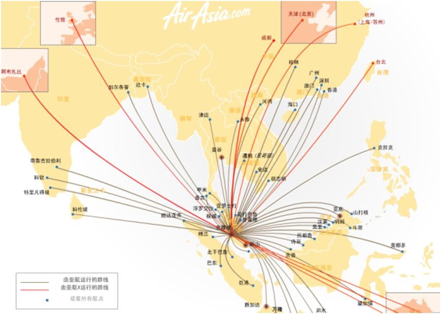 亚洲航空公司:是一家廉价航空公司,所谓廉价航空,是通过取消一些传统航空乘客服务,将营运成本控制得比一般航空公司较低,从而可以长期大量提供便宜票价的航空公司。