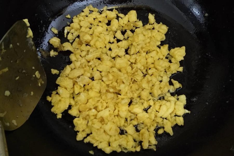 等到面团体积稍微变大后,我们开始拌馅料。鸡蛋打碗中,搅拌均匀,炒锅烧热后,倒入鸡蛋液,快速炒散,盛出放凉。