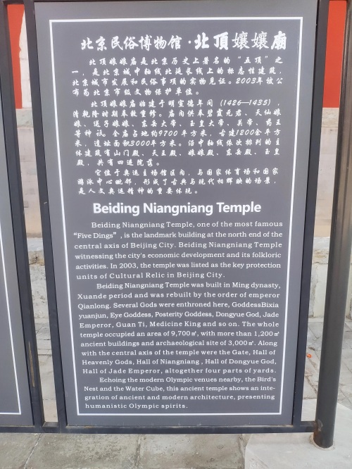 难得还有几天假期,趁着返京的人还不多,到北顶娘娘庙逛了逛,车停在水立方停车场就行,很方便。北顶娘娘庙是位于北京市朝阳区的一座古老庙宇,始建于明宣德年间,是北京历史上的“五顶八庙”之一。