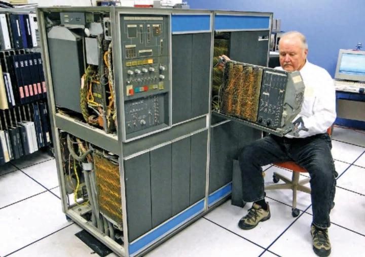 看看这张图片。这是修复者 Ronald Williams 和 1401 大型机处理器。“大型机”一词实际上是指容纳处理器的硬件机柜。这个大盒子只是一个处理器。处理器的机柜里有一堆板。整个架构由经典半导体组装而成,一个简单的处理器就占据了如此巨大的体积。同时,系统性能非常有限。结果发现,今天手掌大小的零件,在当时所占的空间相当于乡村厕所。
