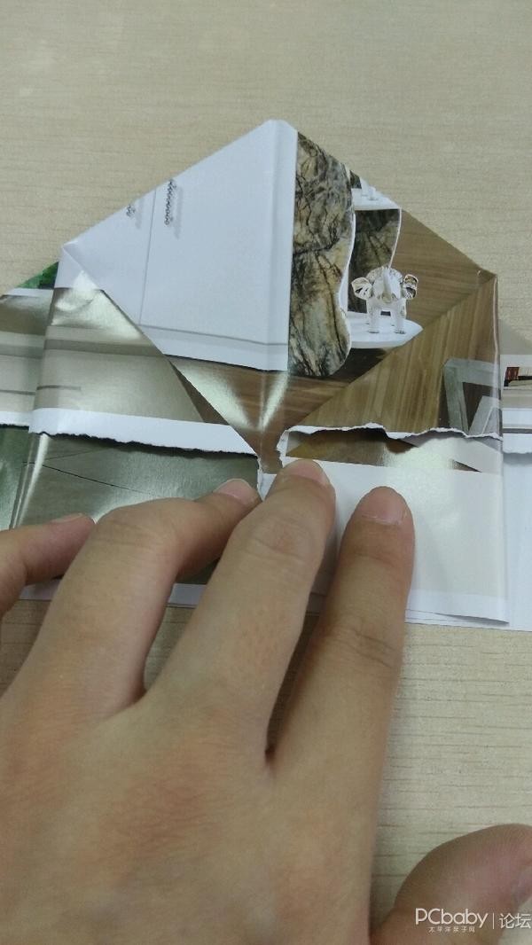 步骤:将纸铺平,横竖各对折一下,然后从上面折角,另一侧也折角,底部纸往上折一下,把两边多余的纸塞到里面即可。[可能语言表达不是很清楚,看图就明白了哦]