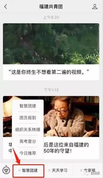 在微信搜索关注“福建共青团”公众号,点击下方菜单栏“智慧团建”,进入智慧团建微官网平台。